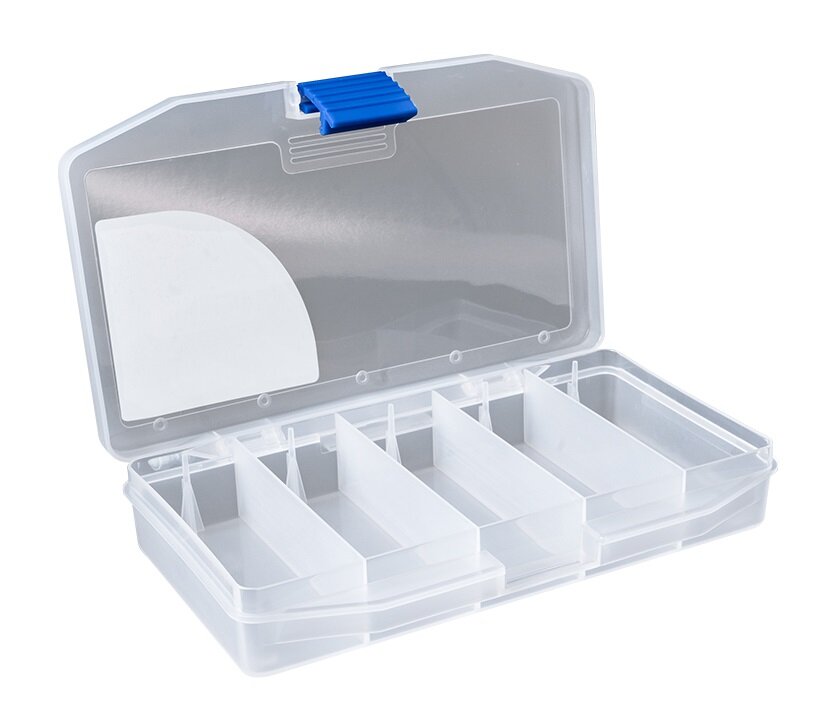 De vakverdelingen zijn over de breedte geplaatst, 5 in totaal, dus de breedte van elk vak is ongeveer 3 cm. Het deksel is transparant, je kunt dus makkelijk zien wat er in zit! Je kunt er van alles in bewaren, denk hierbij aan kleine pluggen, spinners, shads en ga zo maar door! Hij is gemaakt van zonwerend plastic, dus hij raakt niet beschadigd in de zon en breekt niet snel.